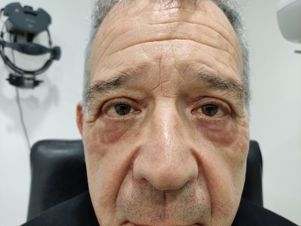 Paciente que presentaba una herniacion grasa inferior, un envejecmiento periocular con arrugas de expresion y una dermatocalasia superior