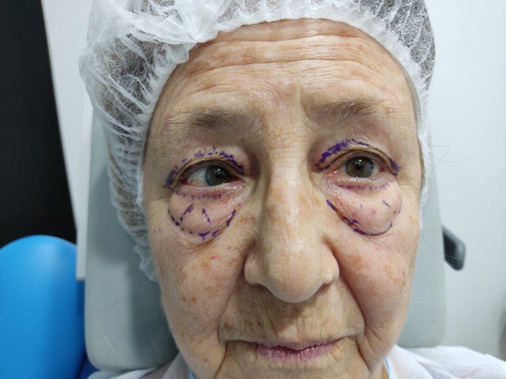 Paciente con herniacion grasa inferior abundante, y redundancia de piel tanto superior como inferior.