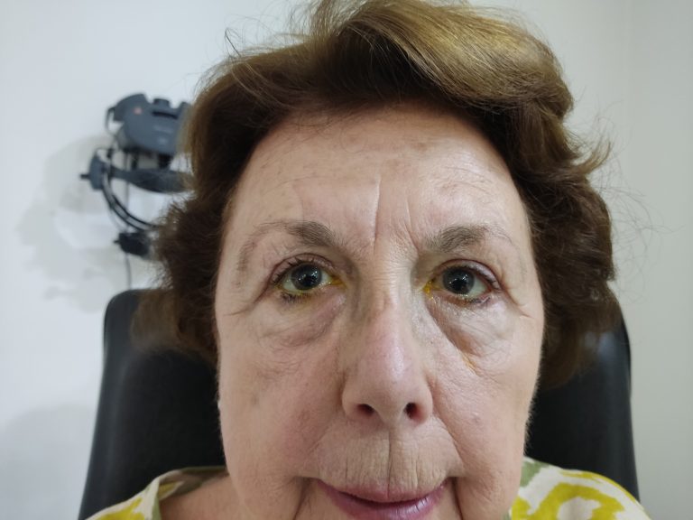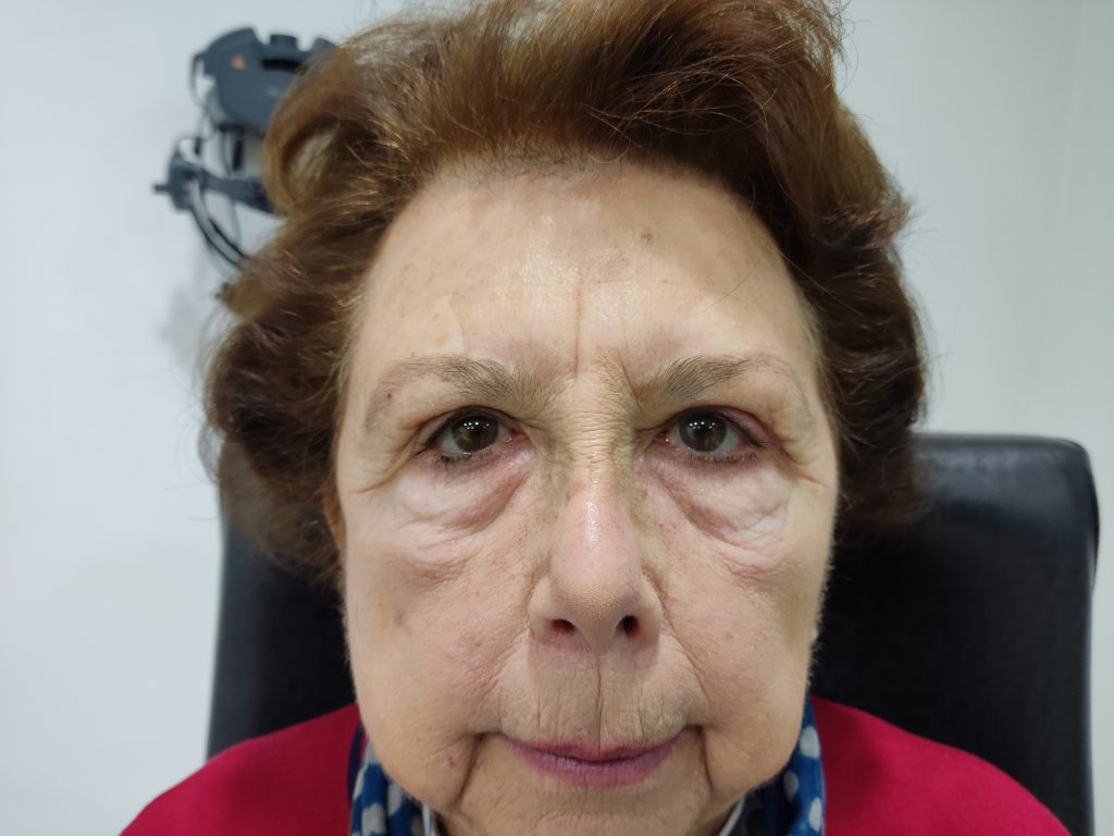 Paciente con una ptosis de ceja bilateral y una dermatocalasia superiror abundante. La paciente solo queria operarse el parpado superior porque tenia problemas para leer.