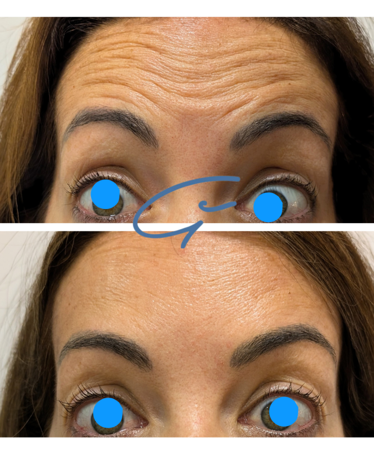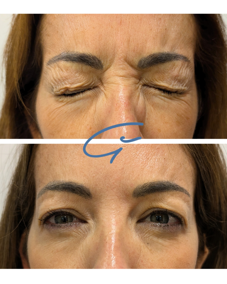 Infiltración de toxina botulínica en tercio superior: glabela, patas de gallo y frente