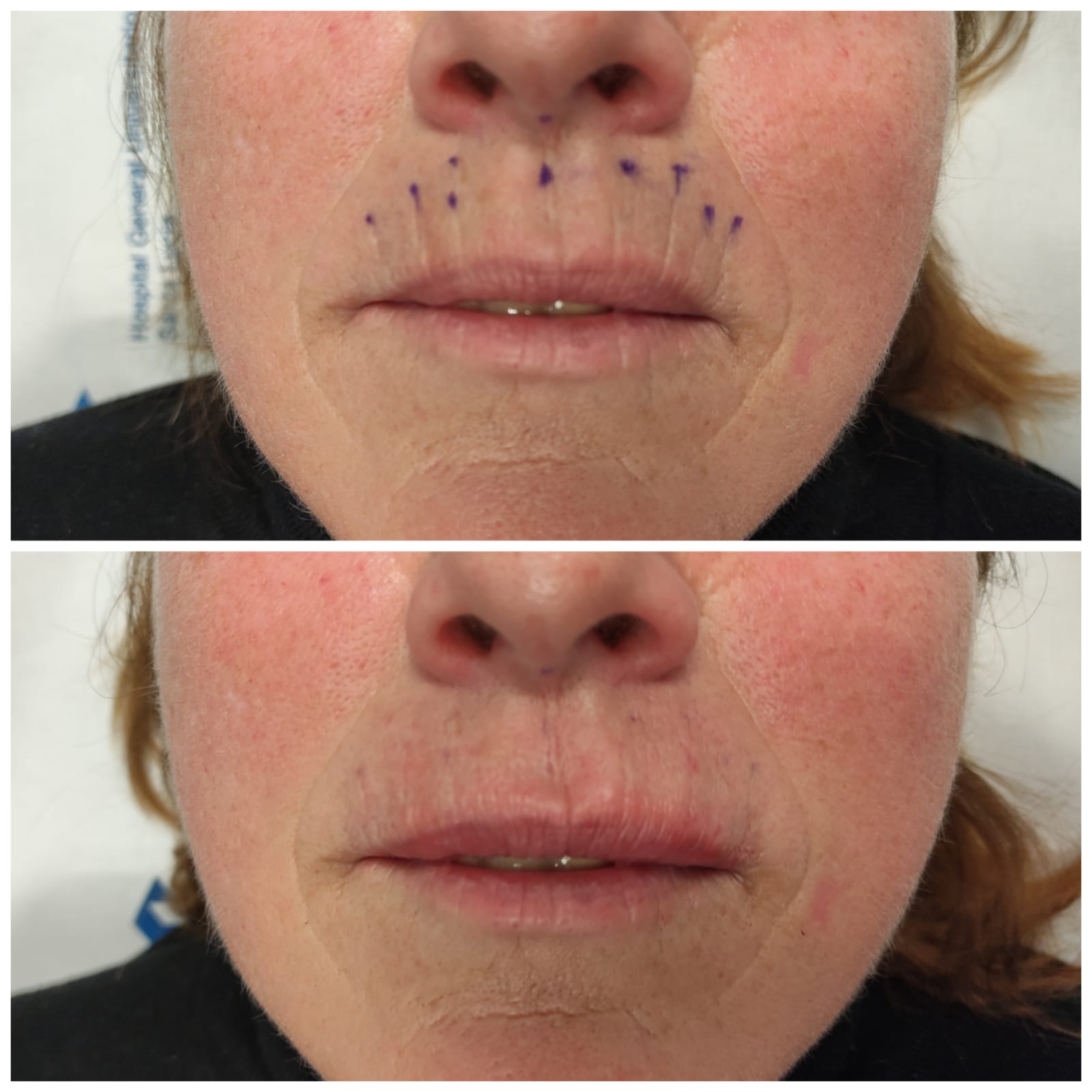 Observamos el resultado tras las dos sesiones. Existe una disminucion marcada de las arrugas de expresion peribucales.